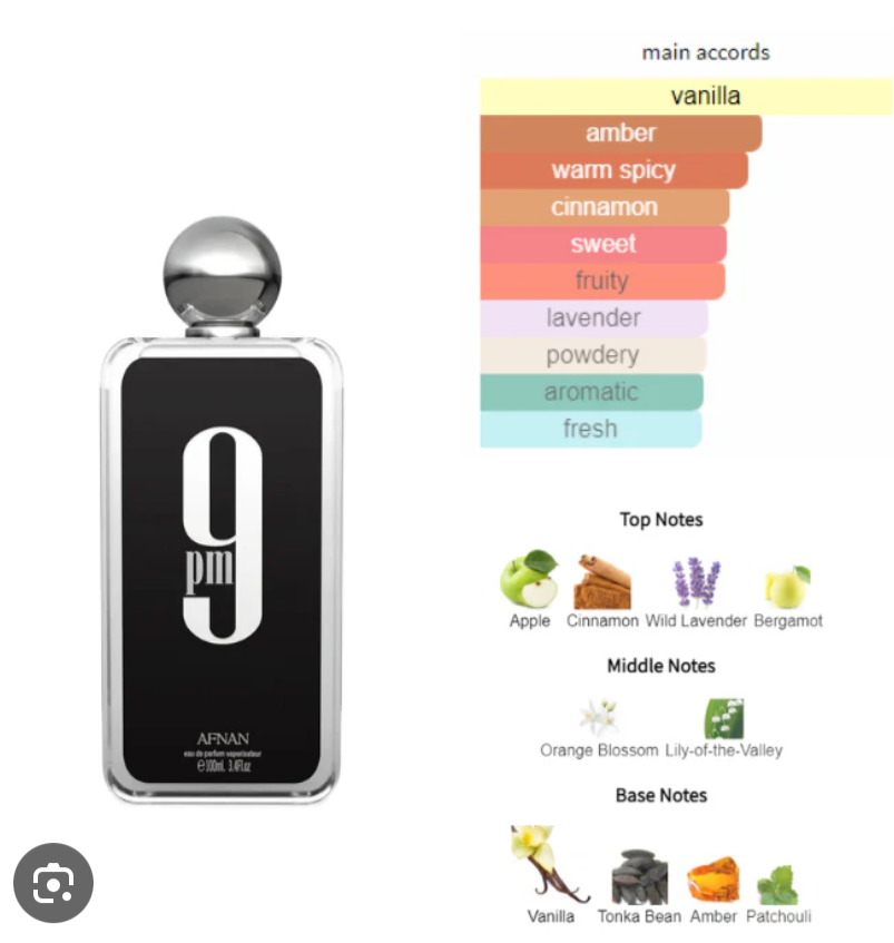 - *9 PM:* A men's fragrance with bergamot, lavandin, cinnamon, and apple notes, perfect for a bold and provocative scent ¹ ² ³.